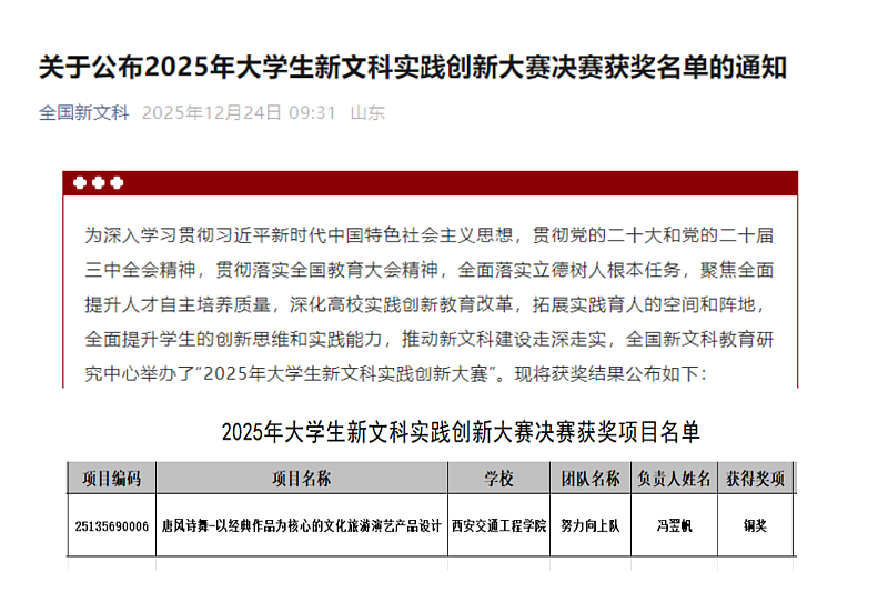 此次获奖是我校在新文科建设领域取得的又一重要突破,充分展现了我校师生在实践创新方面的扎实功底和创新能力。学校将继续深化新文科建设,完善跨学科实践育人体系,推动更多高质量创新成果涌现,进一步提升学生的创新意识与实践能力,为培养高素质、复合型、应用型文科人才贡献力量。
