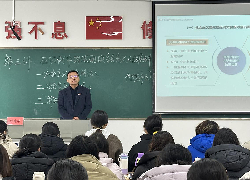 12月18日,财务总监刘建华走进财务管理2401班的思政课堂,以“在实践中探索现实社会主义的发展规律”为主题,为全体学生讲授了一堂思想深刻、案例鲜活的专题思政课。课堂上,刘建华以社会主义五百年发展历程为脉络,从空想社会主义的思想启蒙到科学社会主义的创立发展,从十月革命的伟大实践到中国特色社会主义的蓬勃生机,系统梳理了社会主义从理想到现实、从一国到多国的演进逻辑。他指出,社会主义不是一成不变的教条,而是在实践中不断丰富发展的科学理论,中国特色社会主义的伟大成就,正是我们党在长期实践中探索运用社会主义发展规律的生动例证。他重点阐释了现实社会主义发展的核心规律。他强调,坚持党的领导是探索发展规律的根本保证,立足国情选择发展道路是关键遵循,中国摒弃照搬照抄模式,走出了一条兼具普遍性与特殊性的社会主义现代化道路,以人民为中心是价值旨归,民生保障的持续提质、共同富裕的稳步推进,体现了社会主义的本质要求。授课过程中,刘建华运用启发式教学法,结合区域发展案例、重大工程成就等鲜活素材,将抽象的理论规律转化为可感知的实践图景,引发学生强烈共鸣。他寄语全体学生,要筑牢理论根基,深入学习科学社会主义基本原则与党的创新理论;要锤炼实践本领,将专业学习与国家需求紧密结合,在社会实践中增长才干;要坚定理想信念,做社会主义的坚定信仰者和忠实实践者。
