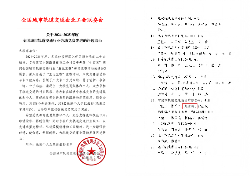 近日,2024-2025年度全国城市轨道交通行业劳动竞赛评选结果正式公布,我校2021届优秀校友赵素梅荣获“服务明星”称号。这一荣誉是对她在一线岗位上专业服务和突出表现的高度肯定,也充分展现了我校人才培养的扎实成效。