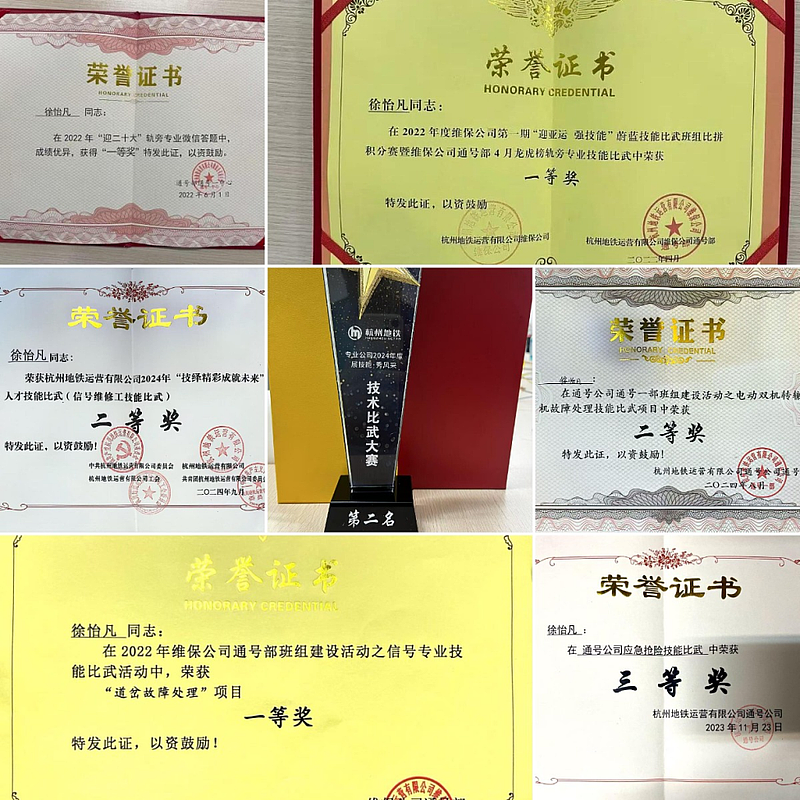 在技能竞技的赛场上,徐怡凡同样展现出过人的专业实力,用沉甸甸的奖项和荣誉,彰显了西交院人的卓越风采。2021年,他在浙江省城市轨道交通技能竞赛信号工项目中崭露头角,荣获三等奖;2024年,他再攀高峰,于浙江省交通运输行业职业技能大赛信号工赛项中力克群雄,勇夺一等奖,并获评“浙江省金蓝领”称号。此外,他在公司内部各类技能比武中同样表现突出,16次斩获荣誉,先后获评杭州地铁运营有限公司“优秀员工”“优秀带教师傅”“优秀兼职培训师”“工会积极分子”等多项称号。