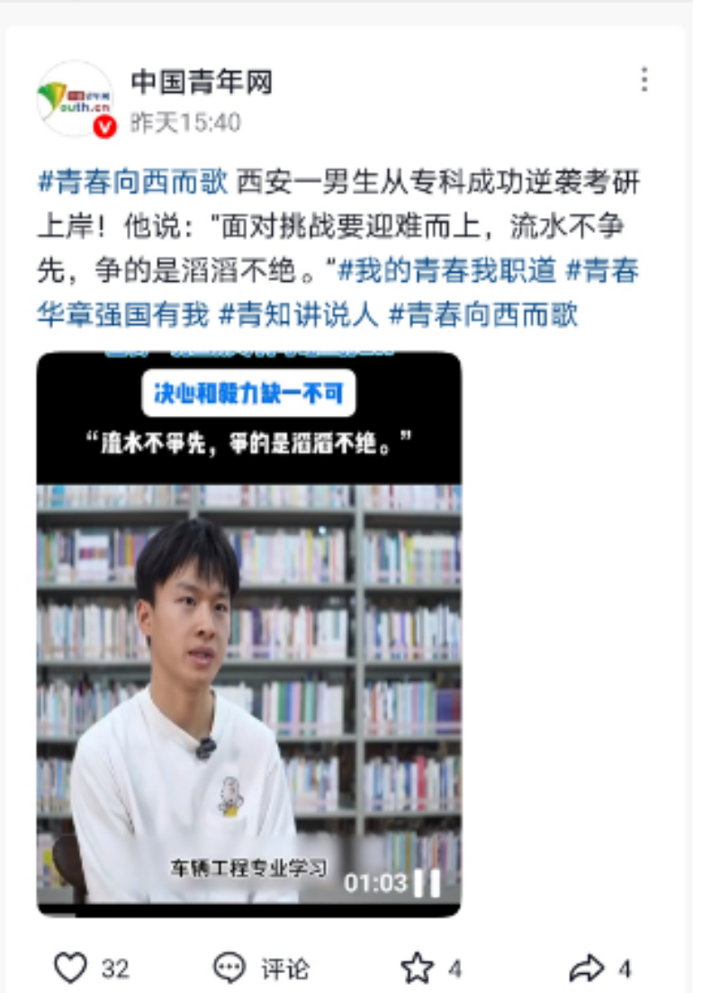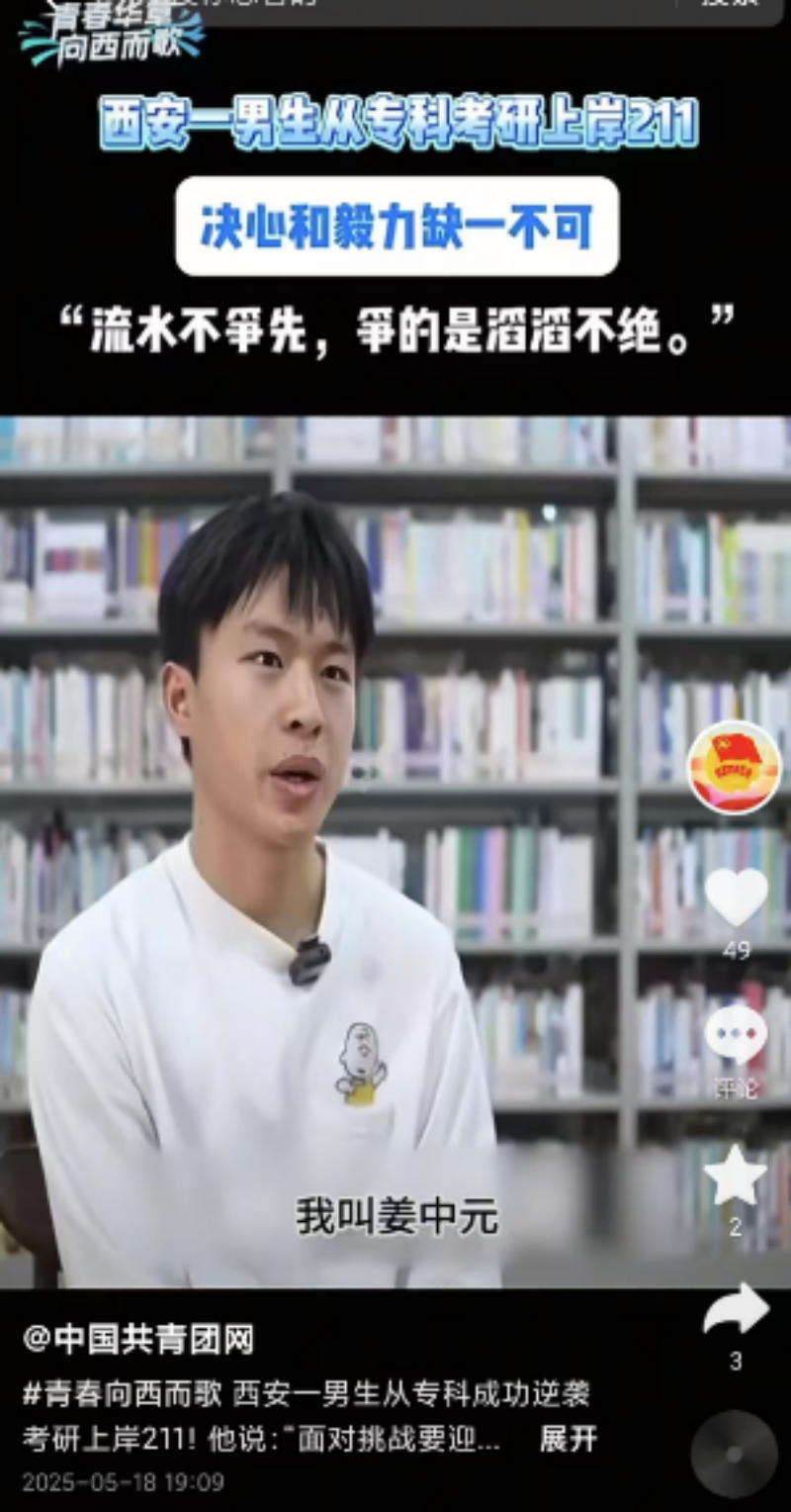 他的故事被陕西省教育厅官微,中国共青团网,中国青年网、纵横视频、三秦青年、新京报教育新闻等多家媒体转载报道;社交媒体上,# 专科生逆袭 211# 的话题阅读量持续攀升,他的事例不仅成为个人奋斗的辉煌篇章,更为无数学子奋勇向前提供了精神动力。目前,姜中元的事迹已成为校园热议话题,激励着更多学子在逆境中突破自我。