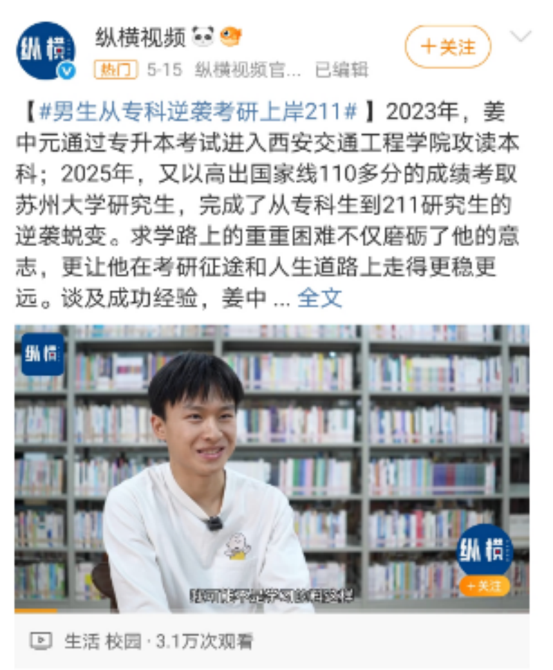 聚焦热议:男生从专科逆袭考研上岸211