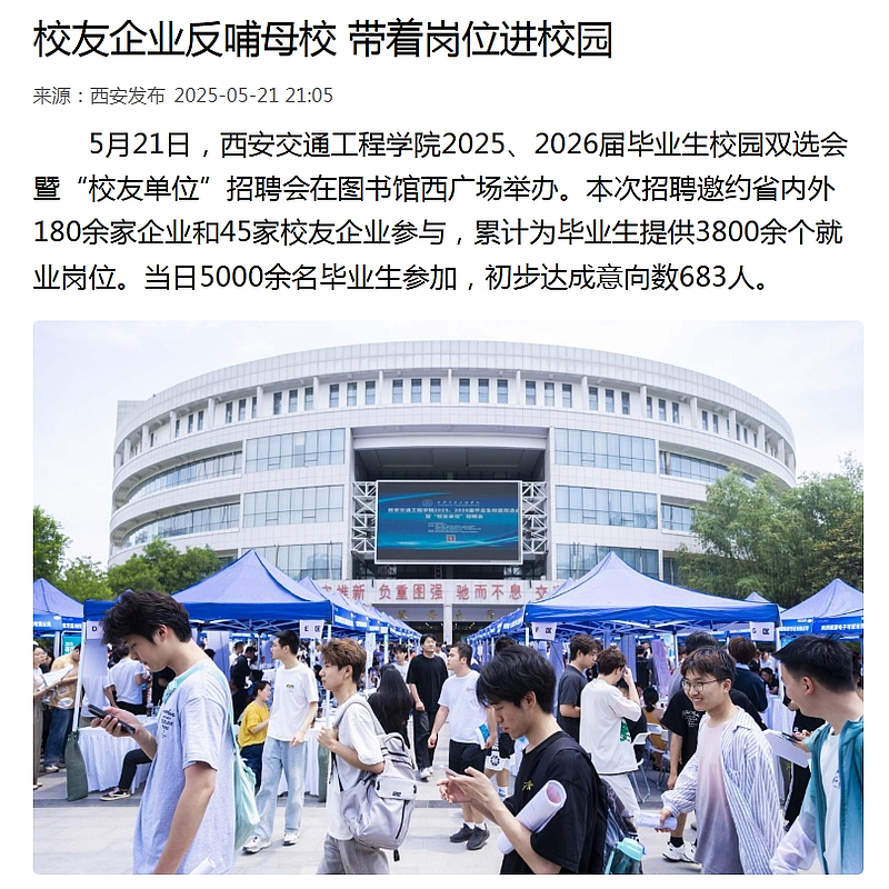 5月21日,西安交通工程学院2025、2026届毕业生校园双选会暨“校友单位”招聘会在图书馆西广场举办。本次招聘邀约省内外180余家企业和45家校友企业参与,累计为毕业生提供3800余个就业岗位。当日5000余名毕业生参加,初步达成意向数683人。