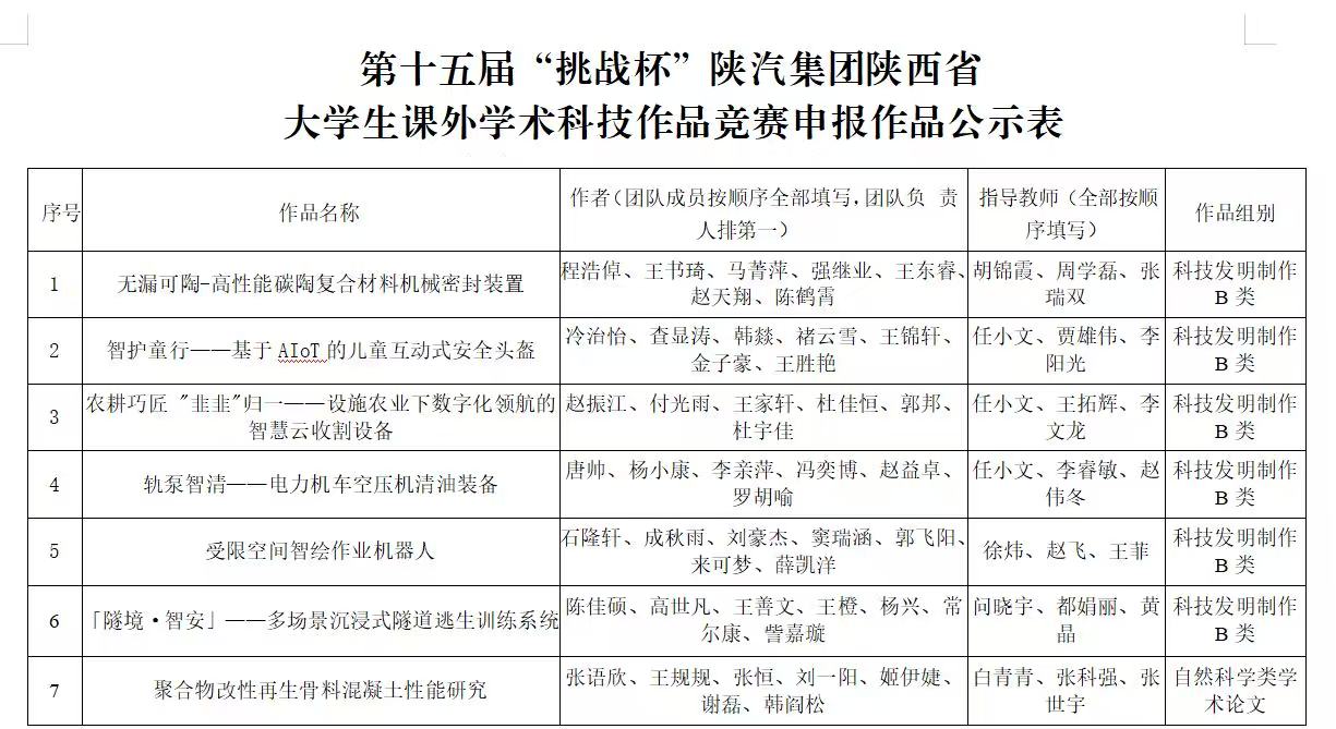 西安交通工程学院2025年“挑战杯”大学生课外学术科技作品竞赛经作品文本评审、答辩评审、评审组会商,已结束赛事所有环节。根据《共青团陕西省委 中共陕西省委教育工委 陕西省科学技术协会等关于组织开展第十五届“挑战杯”陕汽集团陕西省大学生课外学术科技作品竞赛的通知》(陕团联发〔2025〕10号)文件要求,我校从校赛获奖作品中,综合考虑项目成熟度、项目所属类别、学生团队学历层次等因素,拟推荐以下11件作品参加第十五届“挑战杯”陕汽集团陕西省大学生课外学术科技作品竞赛,名单详见附件。