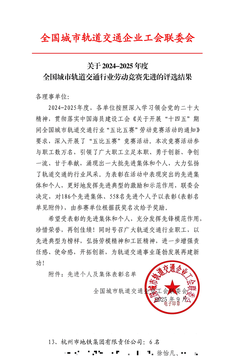 近日,在全国城市轨道交通行业劳动竞赛中,我校2019届电气工程及其自动化专业校友、杭州地铁安全管理工程师徐怡凡凭借出色的专业技能和稳定发挥,荣获“维修能手”称号。