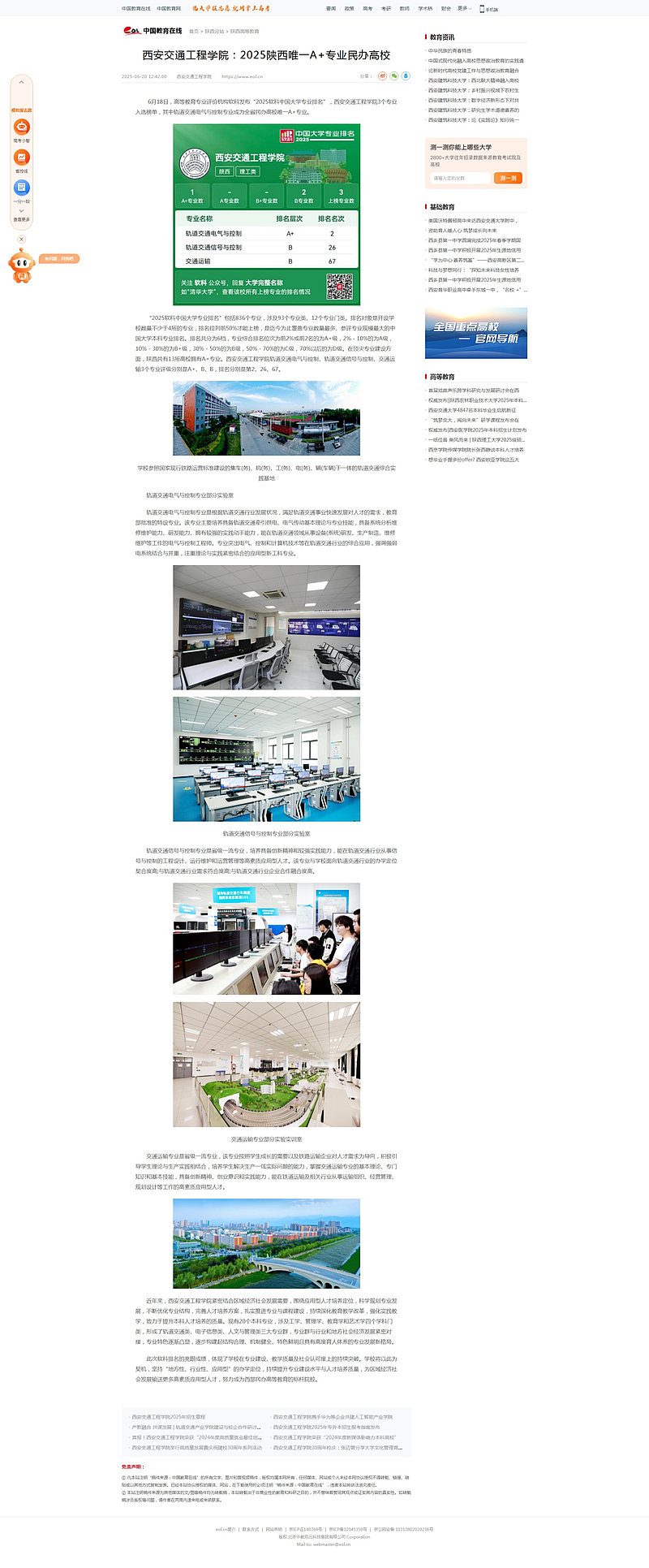 6月18日,高等教育专业评价机构软科发布“2025软科中国大学专业排名”,西安交通工程学院3个专业入选榜单,其中轨道交通电气与控制专业成为全省民办高校唯一A+专业。
