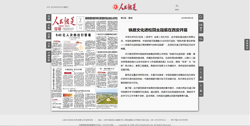 本报北京9月2日电(陈梦竹金锋)8月29日,由中国铁道出版社有限公司、中国铁道博物馆、中国铁路文联摄影分会共同打造的“钢轨传薪·智启新程——铁路文化进校园之高铁精神与创新实践展”,在西安交通工程学院正式拉开帷幕。